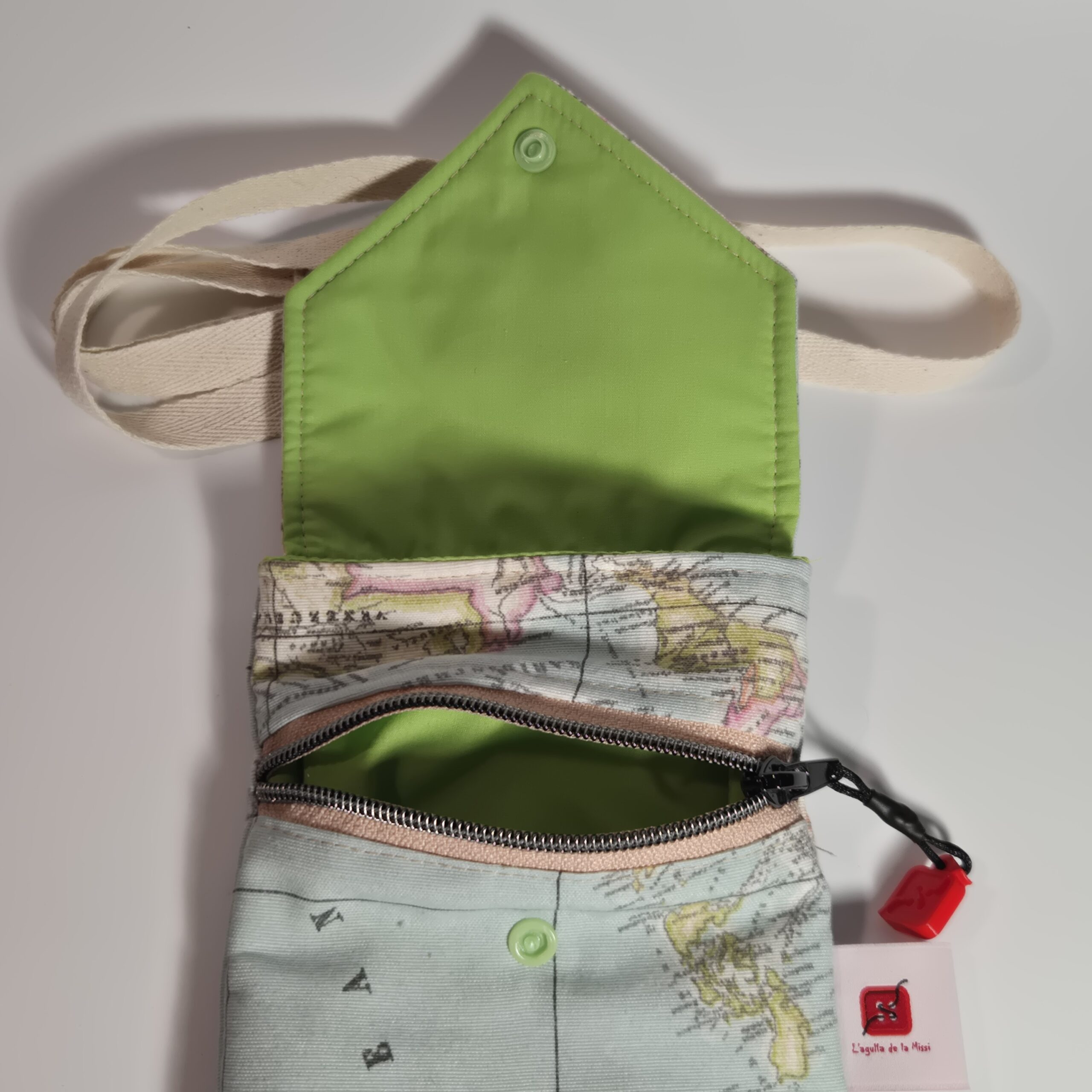 Bolsito para llevar siempre contigo y a mano el móvil. Lleva un bolsillo interior grande para dejar el móvil y otro con cremallera para guardar tarjetas o llaves. Todas tus pertenencias quedan protegidas por una solapa exterior con snap.